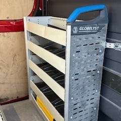Sortimo varebilinnredning med flere skuffer og hyller i metall. Systemet er designet for effektiv oppbevaring og organisering i varebil. Passer for forskjellige typer verktøy og utstyr, og bidrar til bedre utnyttelse av plass i kjøretøyet.stått i caddy maxi.L-173.H-107.B-37