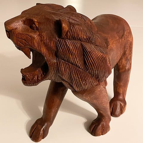 En gammel løve håndskåret i et ukjent treslag, mangler tenner.