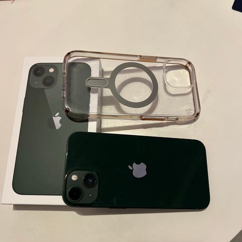 Selge rød iPhone 13 128 GB lagring, batteristatusen 77%. selges med clear silikon apple-deksel, og lader.