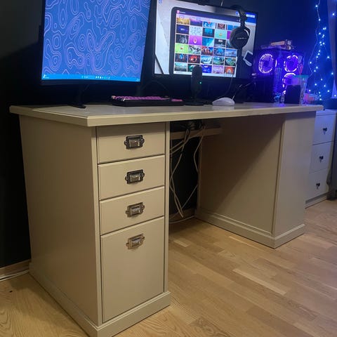 Bordplaten LAGKAPTEN med beina SPÄND selges etter ca 6 måneders bruk som gamingpult. Har dessverre fått noen merker i bordplaten etter et tungt skjermfeste, plassering av merkene er synlig på bildene. Kjøpt nytt for 995, selges for 500,-.