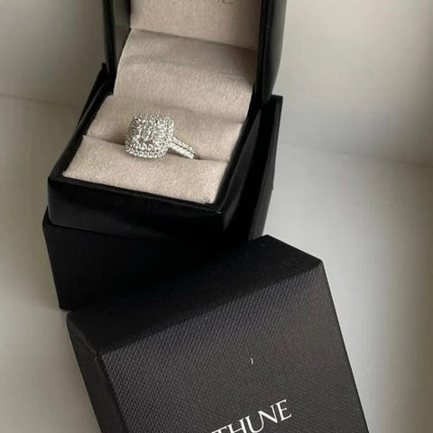 Selger en elegant og tidløs diamantring fra Thune, Princess cut-serien.