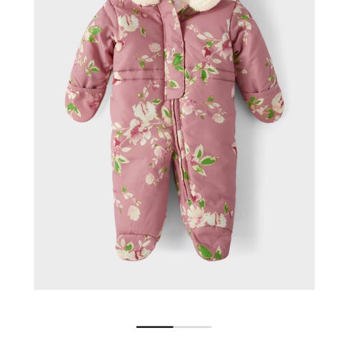 Jacadi kjeledress for barn i størrelse 68, designet for jenter. Kjeledressen er blå og laget av nylon. Den har fôret hette, microfleeceforing for varme, og er fylt med resirkulert polyester. Plagget har trykt mønster, skjult glidelås og trykknapper foran, og inkluderer integrerte votter. Den er uten fot og passer fra 18 måneder.