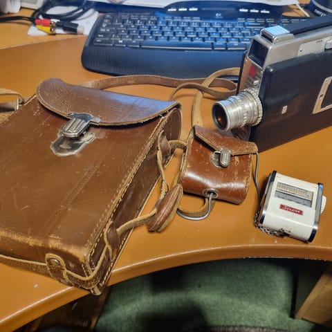 Super 8 Yashica Japansk kamera. Reflex Power zoom 1:1.8 med dobbelt grep. Produsert mellom Oktober og Desember 1959 i følge serie nr. Og det fungerer, men lokket på oppbevarings vesken er litt skadet.