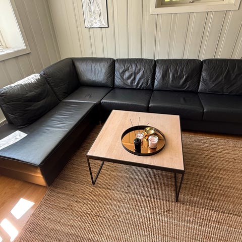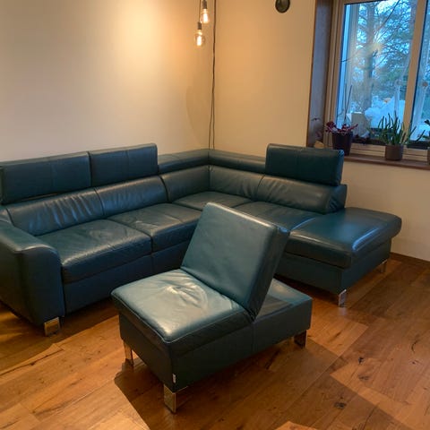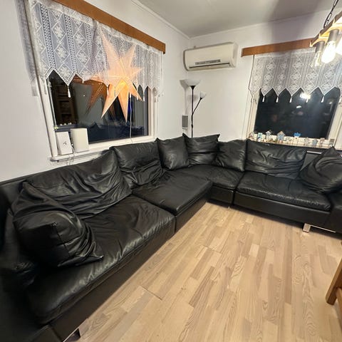 Fin 5-seters Natuzzi hjørnesofa i skinn. Pent brukt, noen merker etter katt, satt inn med fett i ny og ne.
