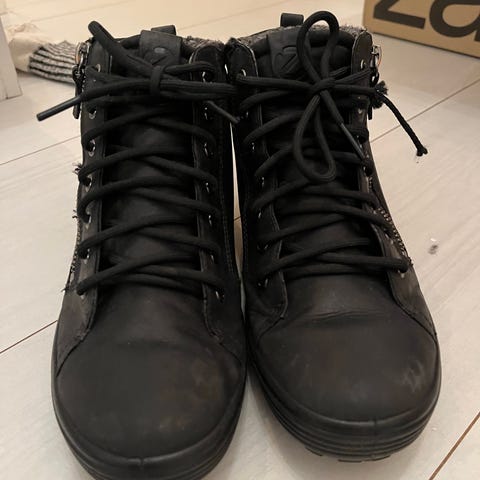 ECCO støvler i størrelse 42, svart farge. Laget av skinnmateriale. Passer til både hverdagsbruk og mer formelle anledninger.