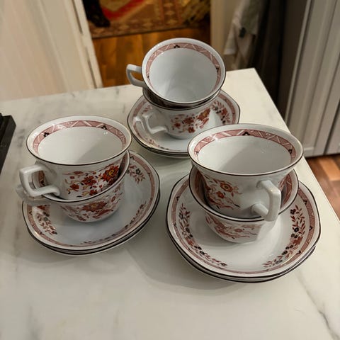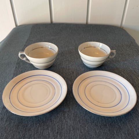 Kaffekopper med dekorative mønstre. Settet inkluderer to kaffekopper, egnet for servering av kaffe eller kakao.