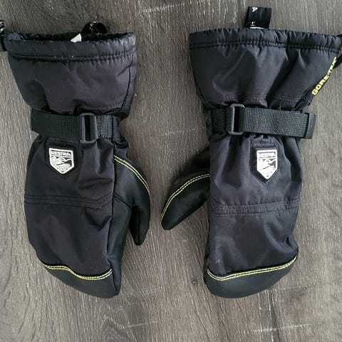 HESTRA Army Leather Heli Ski Jr votter. Str. 7. Farge svart/hvit. Gode, varme og slitesterke votter til barn/junior. Robust HESTRA Triton trelags polyamid stoff på oversiden. Geiteskinn i håndflaten gir godt grep. Uttagbar innervott - superpraktisk med tanke på tørking/vasking. Svært pent brukt! Selges for kr. 600,-.