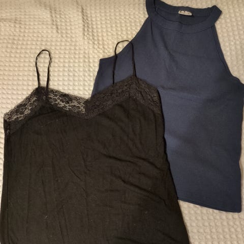 Pent brukte klær, en akryl strikkegenser, en singlet, en trøye, to tskjorter, en cardigan og en denim tights.