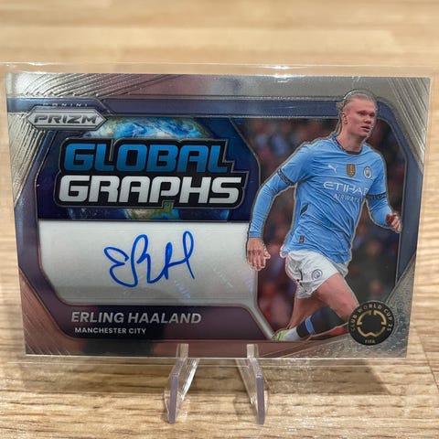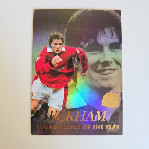 David Beckham fotballkort med bilde fra hans tid i Manchester United. Kortet viser Beckham i rød drakt med nummer 7, og inkluderer statistikk og informasjon om hans prestasjoner og posisjon som midtbane. Kortet har en klar plastbeskyttelse.