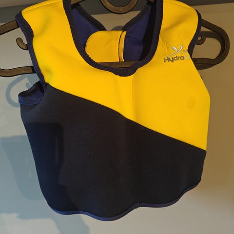 Super svømmevest til barn som gir god oppdrift for barn som leker i vann og øver på å svømme , da den gir oppdrift på hele overkroppen. man kan ta ut flyte elementer for at barnet får mindre flytehjelp . Står inni " up to 20 kg" her har poden brukt den til ca 4,5 i forbindelse med svømming i bhg og lek i basseng og på stranda , den har uv beskyttelse.