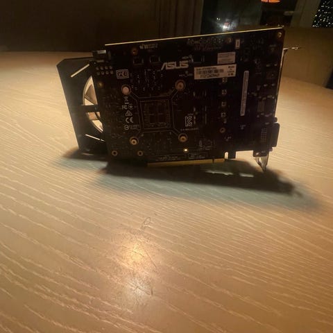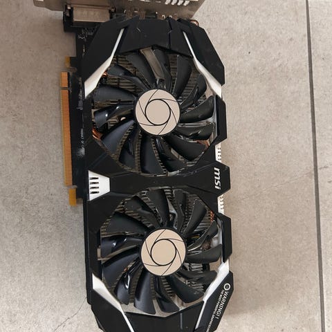 NVIDIA GeForce GTX 1050 skjermkort med vifte, PCIe-tilkobling og flere videoutganger inkludert DisplayPort, HDMI og DVI. Passer for bruk i stasjonære datamaskiner for grafikkbehandling og spill.