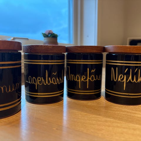Selges da de ikke lenger passer inn på mitt kjøkken. 3 orginale lokk, 1 som bare er i «glass» uten tekst. Se vedlagte bilder.