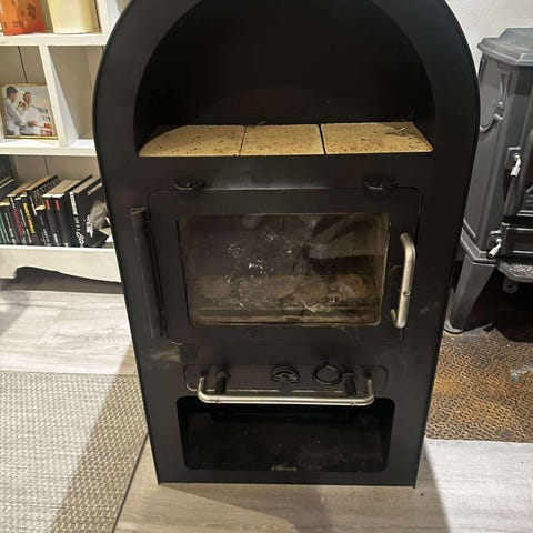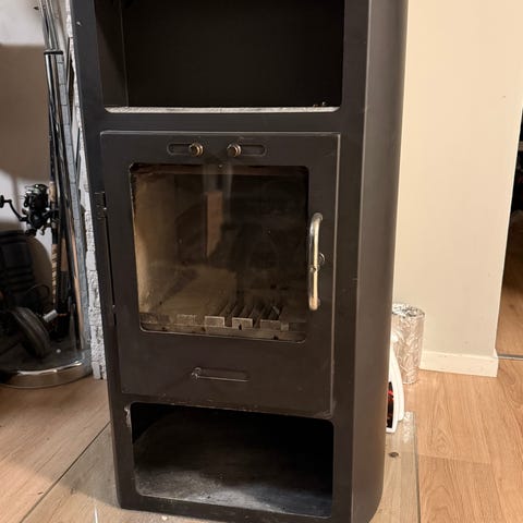 Vedovn i sort metall. Egnet for oppvarming av rom. Designet for effektiv forbrenning og varmefordeling.