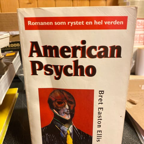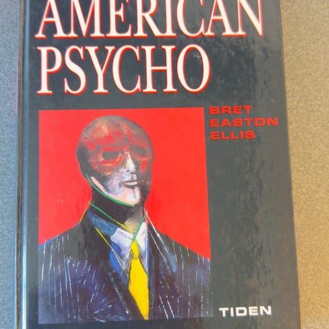 Bret Easton Ellis American Psycho bok utgitt av Tiden Norsk Forlag. Oversatt av Henning Kolstad. Norsk utgave fra 1993, 1. opplag. Romanen er på norsk og inneholder originaltittel American Psycho, copyright 1991. Boken har svart omslag med rød og hvit tekst, og illustrasjon på forsiden.