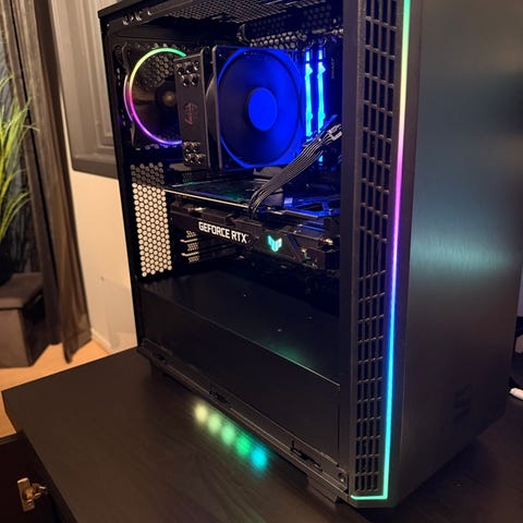 Vurderer å selge min spesialbygde komplett pc- kjøpt 2.8.22. Godt ivaretatt og støvtørket. Aldri hatt noen problemer med den. Lysene har ulike moduser og kontrolleres med app på pc/kan slås av. Må hentes.