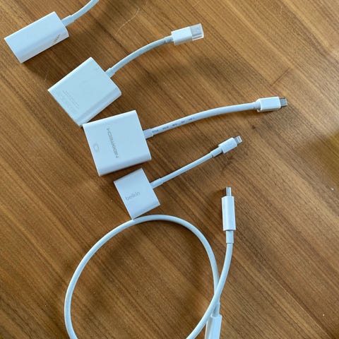 Apple HDMI-adapter med Lightning-kontakt. Adapteren har en HDMI-port for tilkobling til eksterne skjermer og en ekstra port for lading eller dataoverføring. Fargen er hvit.
