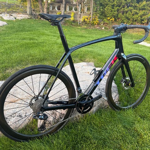 Trek Landevei sykkel designet for unisex bruk. Sykkelen har et lett og aerodynamisk rammeverk, egnet for landeveissykling. Den er utstyrt med skivebremser og har en moderne design med grå og røde detaljer.