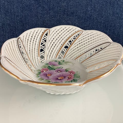 Hvit porselenskål med rosa, grå og gull dekor. Produsert i GDR, så her snakker vi ekte vintage