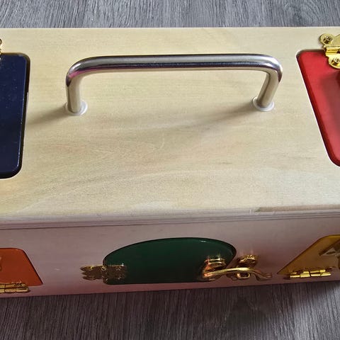 Spillet leveres i en trekasse med magnetisk tavle og inneholder ulike figurer som kan brukes til å lære om former, farger og mønstre. Egnet for pedagogisk bruk og utvikling av finmotorikk og kreativitet.