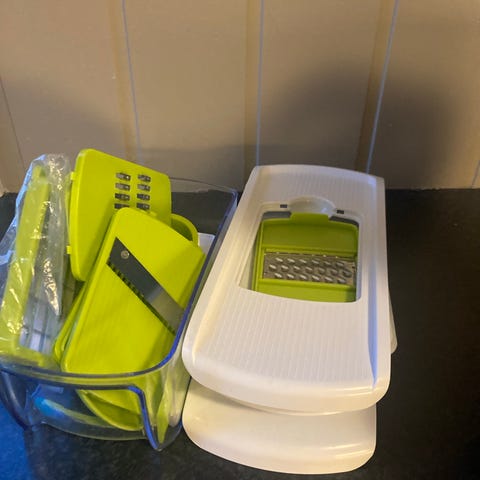 Mandolinen skjærer kjøkkenutstyr med flere utskiftbare blader for skjæring og rivning. effektiv skjæring av grønnsaker og frukt i ulike tykkelser.