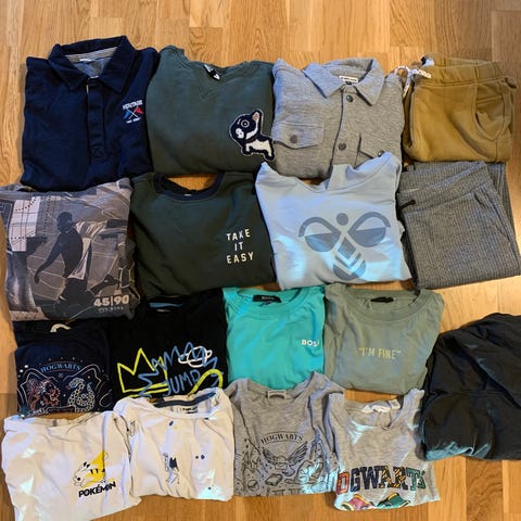 Pakke med 5 bukser og en flere genser og hettejakker str134-140. Noe ubrukt.
