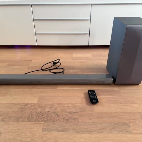 Denon soundbar med tilhørende subwoofer i svart farge. Systemet inkluderer en trådløs subwoofer og fjernkontroll. Strømkabler medfølger, men ikke HDMI-kabel.