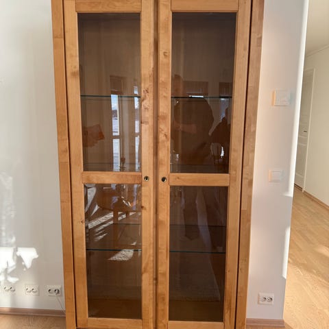 Nytt svart vitrineskap med 2 dører og 3 hyller.