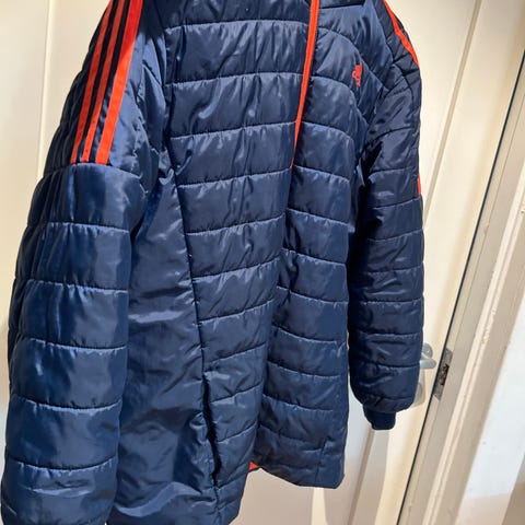 Ny Adidas Fotball jakke for herre i størrelse L. Jakken er marineblå med hvite detaljer.