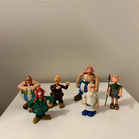 Samling av figurer fra Asterix og Obelix, inkludert karakterer som Asterix, Obelix, og andre. Figurenes størrelse og materiale er ikke spesifisert. Passer for samlere og fans av tegneserien.