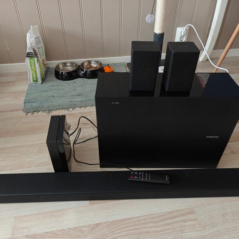 Samsung høyttalersystem med 5.1 surroundoppsett bestående av en subwoofer, en senterhøyttaler og fire satellitthøyttalere. Systemet er designet for å gi lyd i flere kanaler og forbedre lydopplevelsen ved bruk med kompatible lyd- og videosystemer.