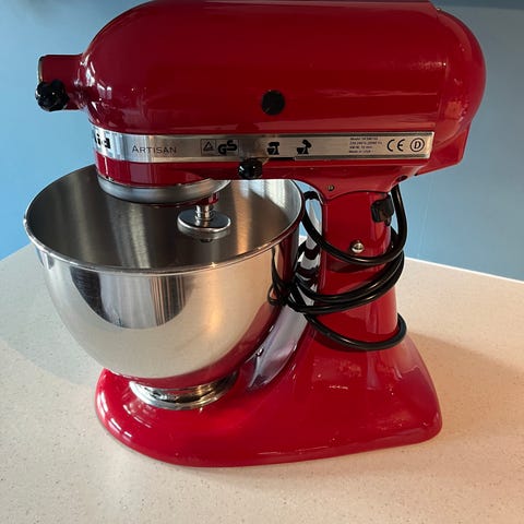 KitchenAid Artisan kjøkkenmaskin i mint farge med rustfri stålbolle. Egnet for ulike bake- og matlagingsoppgaver.