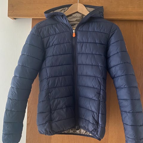 Save The Duck dunjakke i blå farge, størrelse 164 for gutt. Jakken er laget av dunmateriale og er designet for barn. Hunden bet henne slik at hun ble delt i to, så jeg måtte sy henne sammen igjen. Jeg tror jeg gjorde en god jobb. :) Jeg har lagt det ut slik at det vises på bildene, så dere ser det med en gang. :)