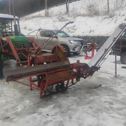 Transport bånd går på vanlig strøm, vedmaskin på 3 fas el koble på traktor. Denne kapper og kløyver i 1 operasjon.