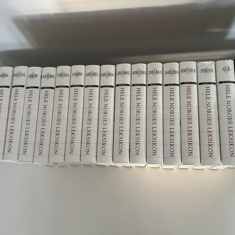 Hele Norges Leksikon bokserie med flere bind. Inneholder omfattende oppslagsverk med illustrasjoner, kart og fakta om ulike temaer.