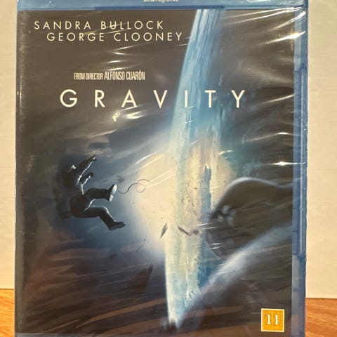 Blu-ray film Gravity med skuespillerne Sandra Bullock og George Clooney. Filmen har aldersgrense 11 år.