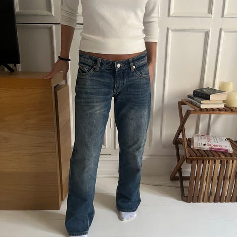 Denimbukser i svart farge med lommer foran og bak, størrelse XS.