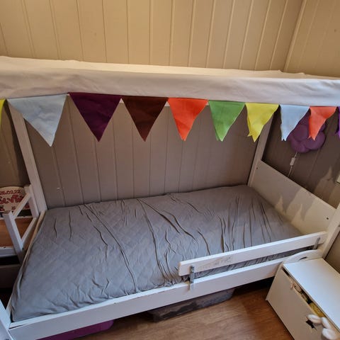 Solid ikeaseng med målene 167x77cm, 80 høy på den høyeste enden. Godt brukt an 1 barn og hund, gis bort uten madrass. Noen riper i malingen her og der, 2 snå hull etter skruer, blir super ned en vask og litt maling.