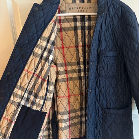 Jakken er kjøpt i London, og har det klassiske Burberry-rutemønsteret på innsiden av hetten.