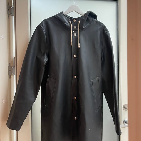 Svart regnjakke fra Stutterheim. Tykt gummistoff/oljehyre, tåler skikkelig pøsregn. Str S, men er mer som en M, spørs hvordan passform man vil ha. Kjøpt for å kunne ha tykk genser/fleece under. Noen merker på innsiden av jakken, men ingenting å si for bruken. Pen utenpå.