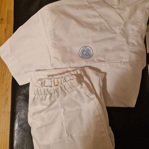 Har også et der det står Sara Martinsen sykepleierstudent som fulgte med en uniform, selges for 39kr. Etternavnet kan markeres over