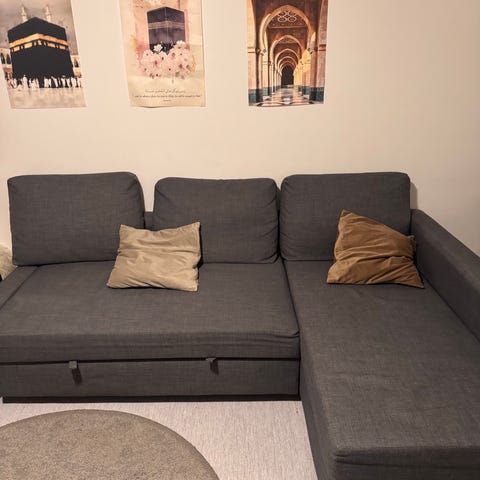 Sovesofa i mørkegrått stoff. Oppbevaring for dyner etc i ene delen, den andre delen kan trekkes ut så det blir en dobbeltseng. Har tilhenger og kan være behjelpelig med levering på adresse i Oslo-området.