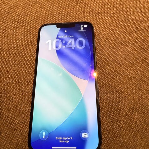Apple iPhone 14 mobiltelefon med 128 GB lagringskapasitet i hvit farge. I god stand, men noe bruksmerker finnes..