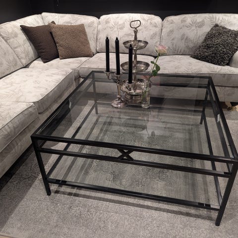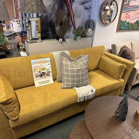 Cornelia-sofa fra Furninova selges. Sofaen har vært brukt som spisebordsofa, noe som betyr mindre slitasje enn en tradisjonell stuesofa. Den er godt ivaretatt, har høy sittekomfort og tidløst design.