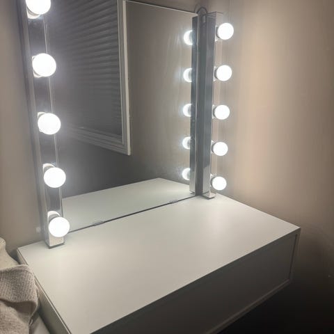 Nypris for lysene sammen med lyspærene lå på 1043kr (fra IKEA). Speilet husker jeg ikke nypris på (usikker på hvor den er kjøpt). Så veldig fint pris å få alt samlet for 900kr❤️ Noen veldig få bruksmerker, men de er for de meste på bakdelen av lysene (så man ser det ikke). Ellers ser de veldig pent brukt❤️ Kan hentes på Alexander kiellands plass.