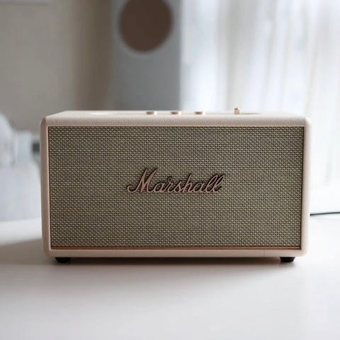 Marshall trådløs høyttaler i hvit farge med kontrollknapper på toppen. Høyttaleren har et klassisk design med metallnett foran og tre justeringsknapper for lydstyrke, bass og diskant. Kan koble til trådløs med Bluetooth og app.