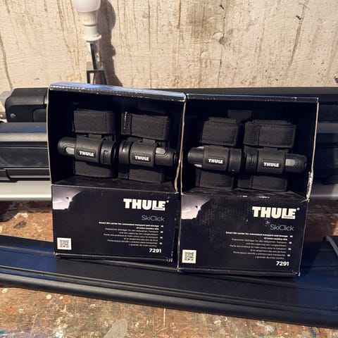 To sett Thule SkiClick som er nesten komplette. Mangler kun klistremerkene som settes på ski for å vise hvor stroppene skal festes.