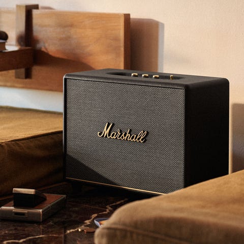 Marshall høyttaler med klassisk design og kontrollknapper for volum, bass og diskant. En bærbar lydenhet med retrostil, egnet for bruk i ulike rom og miljøer.