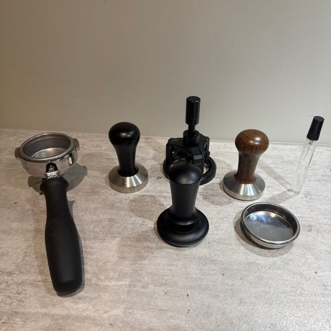 Rancilio Bottomless Portafilter holder uten bunn, designet for bruk med espressomaskiner. Passer til baristaer som ønsker å overvåke ekstraksjonsprosessen direkte. Leveres med 2 kopper og 3 kopper filter innsats
