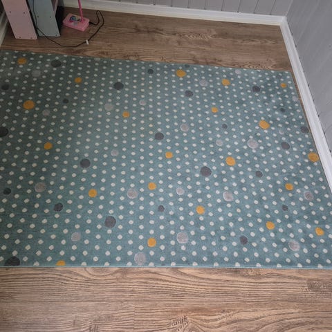 Teppet er pent brukt og har ligget under et legobord i kjellerstuen. Derav de 4 benmerkene på teppet.