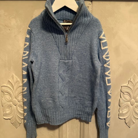 WoolLand ull genser i størrelse 134 for jenter. Genseren er rosa og laget av ullmateriale. Den har en halv glidelås i front og broderte detaljer på ermet og brystet.